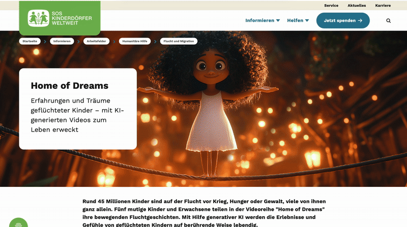 Vier geflüchtete Kinder erzählen in kurzen Interviews von Herkunft, Ankommen und ihren Zukunftsträumen. Zum Schutz wurden sie als KI-generierte Pixar-Charaktere dargestellt – auf Basis ihrer echten Fotos. Die O-Töne in Muttersprache bildeten die Grundlage für emotionale Kurzfilme, animiert mit Runway.